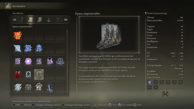 - Préparez votre build : Les Épines Impénétrables exigent un investissement significatif dans les statistiques de magie et de foi. Assurez-vous que votre build est orienté vers ces attributs pour maximiser les dégâts infligés par le sort.
