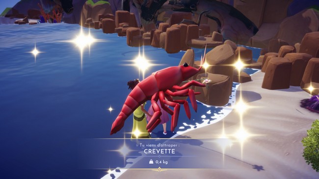 - 2 crevettes : Pêchez-les dans les cercles bleus de la Plage Enchantée.