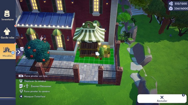 Avec ces éléments, fabriquez 3 tables de bistro et 6 chaises de bistro depuis l’onglet « Meubles » d’une station d’artisanat. Placez-les près du stand de Tiana et ajoutez deux décorations élégantes pour finaliser l’aménagement extérieur.