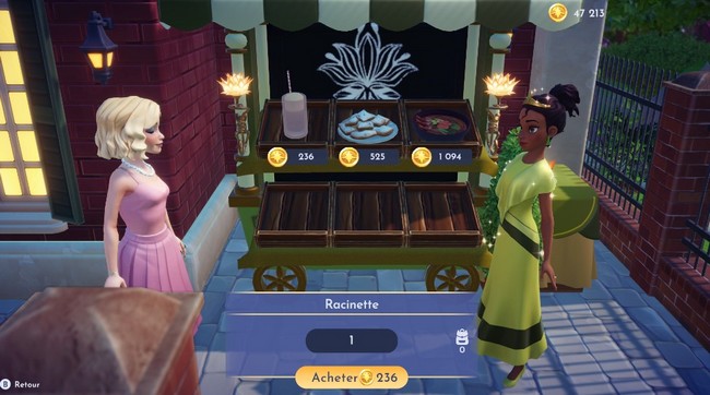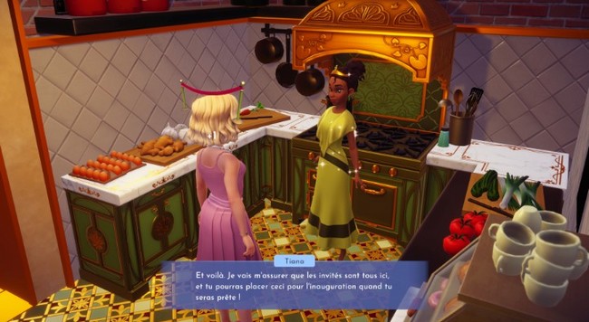 Tiana souhaite marquer l’inauguration de son stand en invitant Mère Gothel et Vaiana. Rendez-vous auprès de ces deux villageoises pour leur transmettre l’invitation. Vous aurez également l’occasion d’écouter Tiana discuter cuisine avec Rémy si vous le souhaitez.