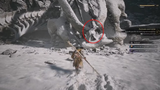 - Localiser l’Arène Sous la Colonne Vertébrale de Squelette : En longeant la côte droite de la rive nord, vous découvrirez une arène sous une immense colonne vertébrale de squelette. C’est ici que vous affronterez la Chauve-Souris Apramana, le boss qui détient la clé pour obtenir la Larme de la Tortue.