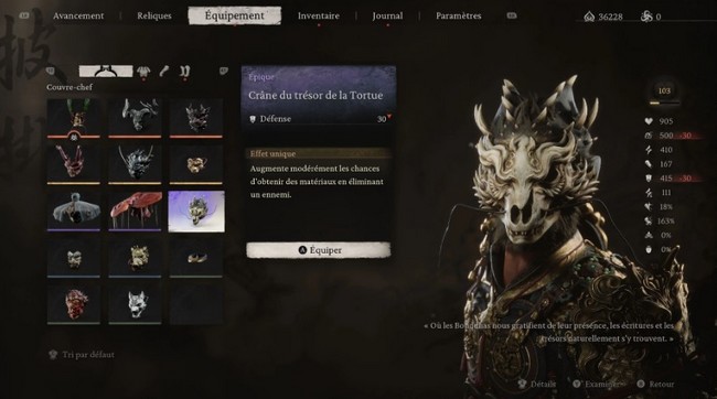 Un autre lieu, bien plus pratique pour obtenir cet équipement, se situe dans le Chapitre 5, aux Champs de flammes, Col cendreux III. Ici, vous aurez une meilleure chance d’affronter un Yaoguai qui porte le Crâne du trésor de la tortue, ce qui en fait un endroit de farm idéal.