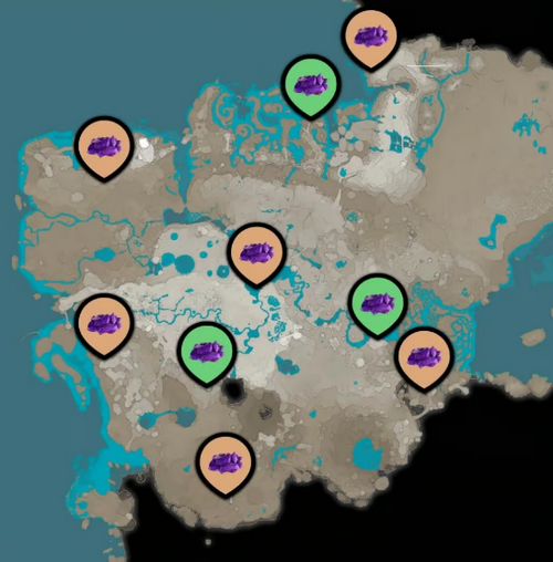 Les gisements purs de minerai d’E.M.E. sont particulièrement convoités en raison de leur rendement élevé. Si vous cherchez à maximiser l’extraction, vous devez vous rendre dans trois endroits clés de la carte : Western Dune Forest, Eastern Dune Forest, et Spire Coast.