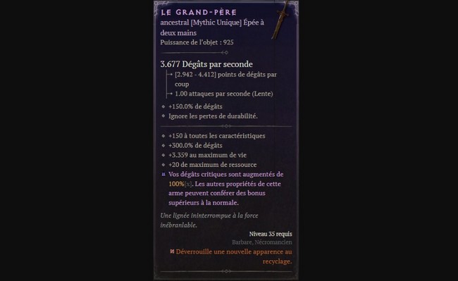 L’épée « Le Grand-père » est un objet mythique unique, ou Uber Unique, dans Diablo IV. Portée par un Barbare ou un Nécromancien, cette arme procure un bonus impressionnant : elle augmente les dégâts critiques de x100%. Outre cet effet spectaculaire, l’épée peut également conférer des bonus supérieurs à la moyenne dans diverses caractéristiques.