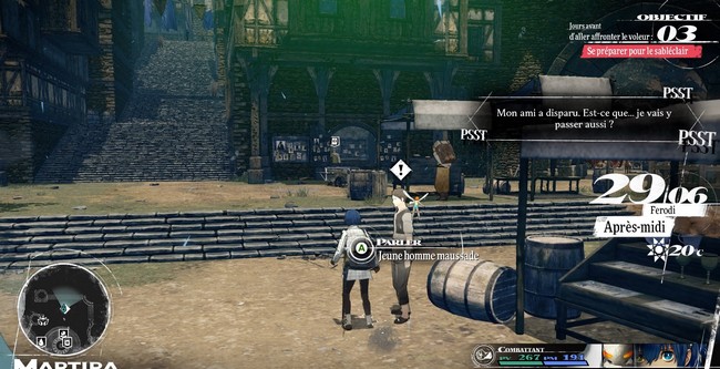 - Une fois à Martira, rendez-vous sur la place centrale et engagez une discussion avec un jeune homme pour activer la mission « Palombe d’un plan ». Cette étape est indispensable pour progresser dans la quête « Étincelle Créatrice ».