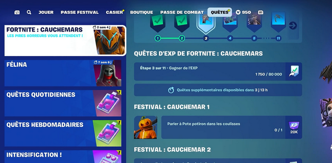 Une fois le dialogue avec Pote Potiron complété, le défi sera automatiquement validé. Vous recevrez alors des récompenses exclusives propres à l’événement Cauchemar de Fortnite. Celles-ci peuvent inclure :