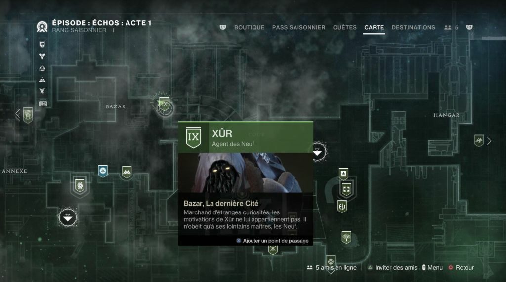L’emplacement de Xur dans Destiny 2 change chaque semaine. Pour le vendredi 18 Octobre 2024, Xur se trouve au : Bazar