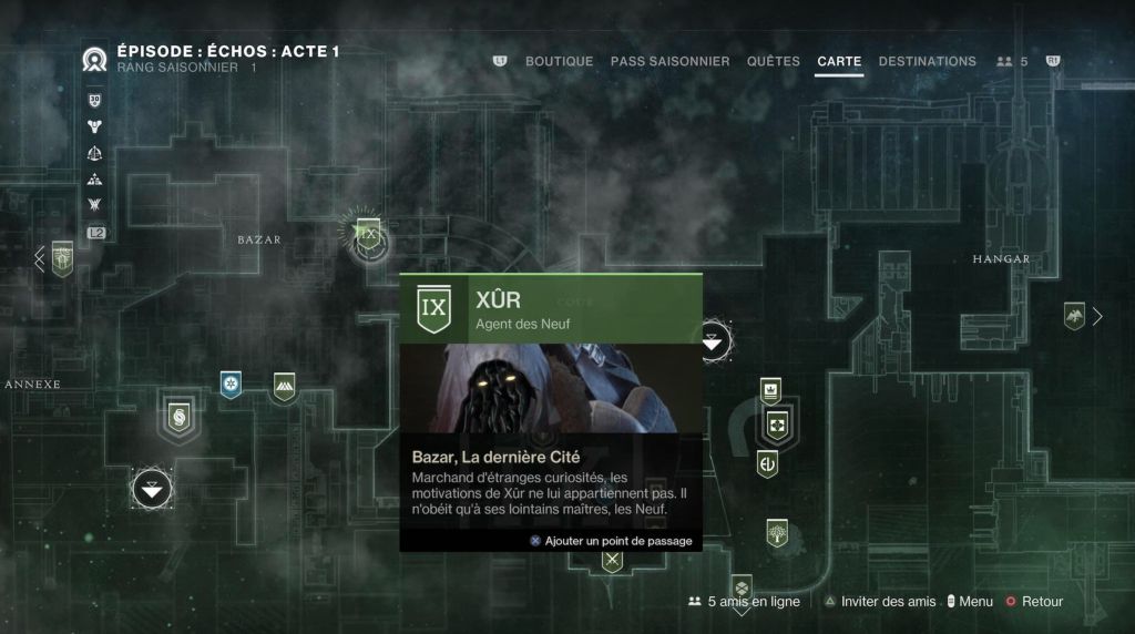 L’emplacement de Xur dans Destiny 2 change chaque semaine. Pour le vendredi 18 Octobre 2024, Xur se trouve au : Bazar