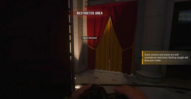 Vous devez le contourner discrètement pour atteindre une pièce située derrière des rideaux rouges.