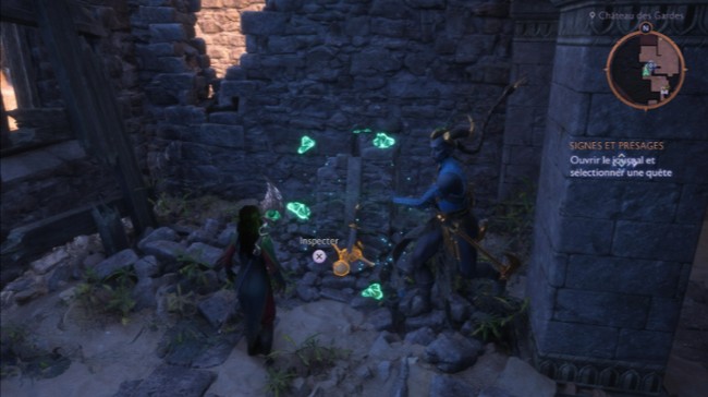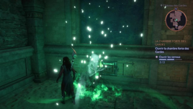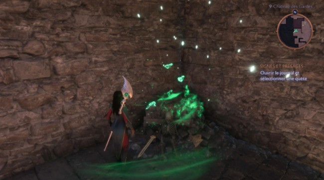 Pour le deuxième verrou, dirigez-vous vers le sud-ouest du Château des Gardes. Dans une petite zone extérieure, un squelette empalé avec des papillons verts attire votre attention. En inspectant le squelette, un esprit apparaîtra, et vous devrez le suivre dans un jeu de cache-cache à travers le château.