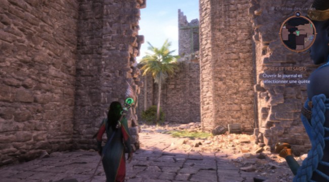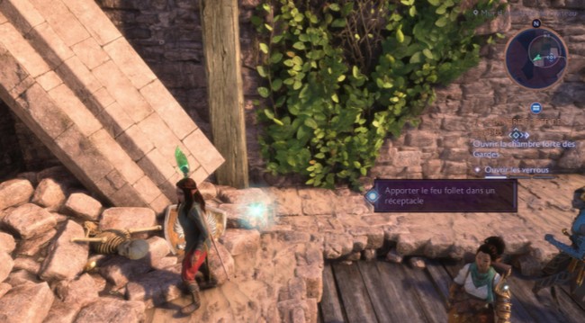 Pour le dernier verrou, rendez-vous dans la cour sud du Château des Gardes. Sur la droite, une structure pourra être détruite par Taash, révélant une échelle. Montez cette échelle pour atteindre le troisième étage, où vous trouverez un feu follet. Approchez-vous de lui pour qu’il vous suive.