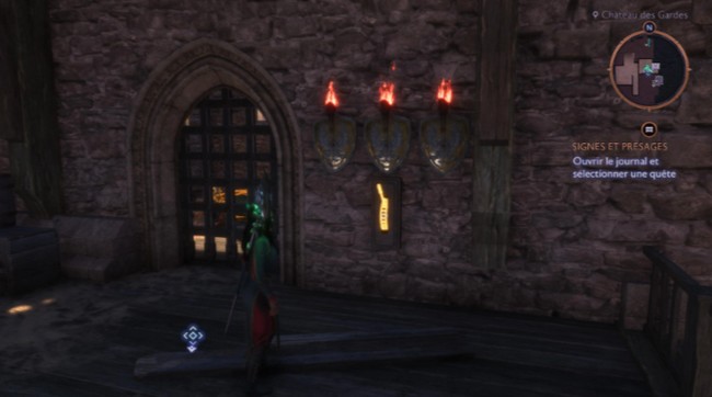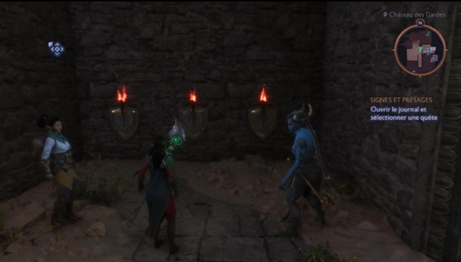 Pour déverrouiller le premier mécanisme, commencez par revenir à l’entrée du Château des Gardes. Sur la droite, un mur destructible peut être pulvérisé grâce au souffle draconique de Taash. Derrière cette ouverture, vous trouverez trois boucliers accrochés au mur, surplombés de torches. Allumez les trois torches pour entendre un déclic, indiquant l’apparition d’un levier au niveau supérieur.