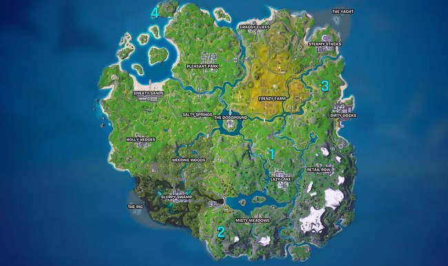 Pour vous faciliter la tâche, une carte a été créée pour illustrer les quatre emplacements des enregistrements audio dans Fortnite Remix. Utilisez-la pour optimiser votre recherche et compléter ce défi rapidement.