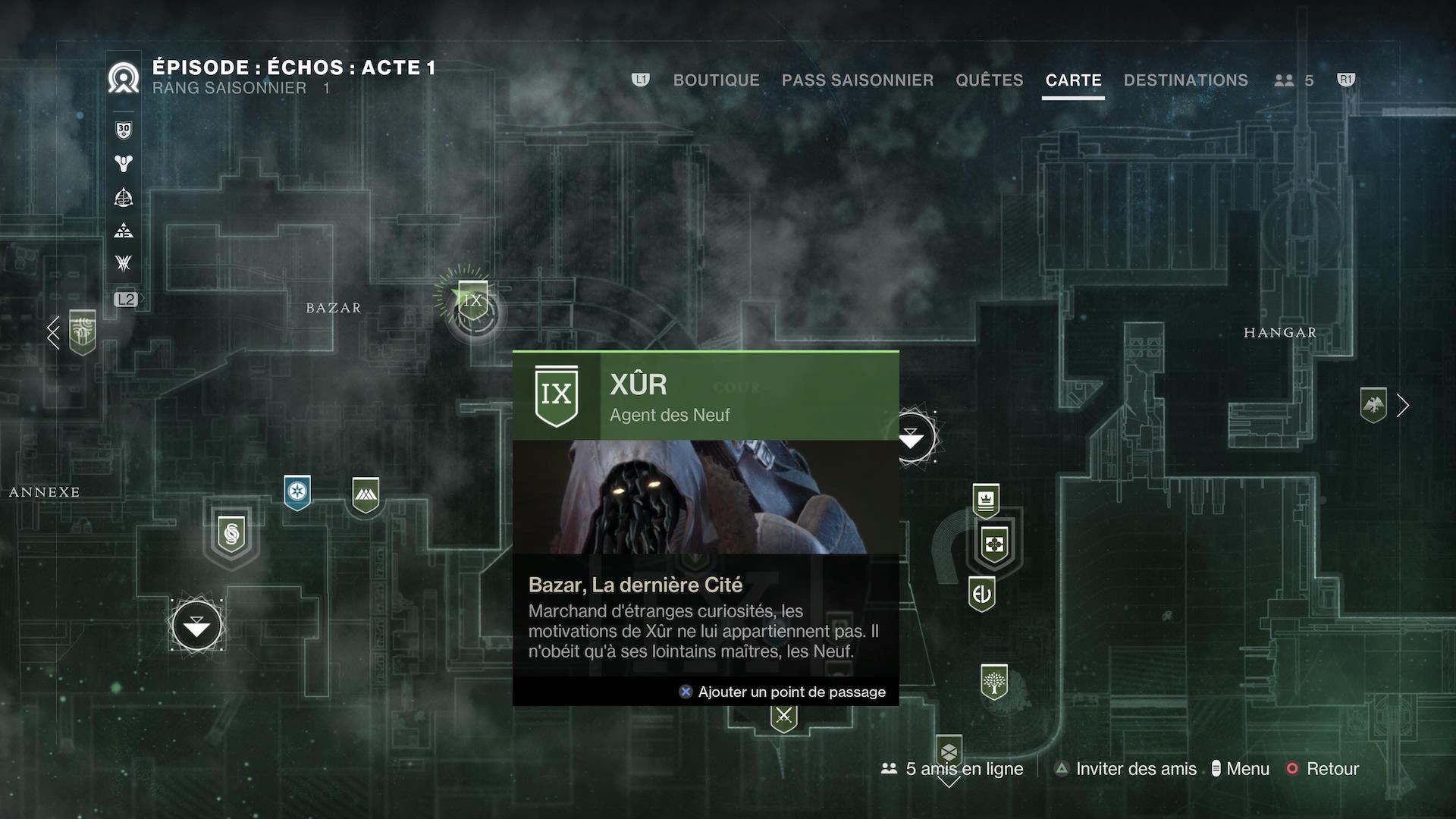 Chaque semaine, Xur se déplace dans un endroit différent de l’univers de Destiny 2. Pour savoir où il se trouve aujourd’hui, il est essentiel de repérer le nom du lieu exact et de localiser la planète correspondante. Xur restera dans son nouvel emplacement jusqu’à la prochaine réinitialisation hebdomadaire.