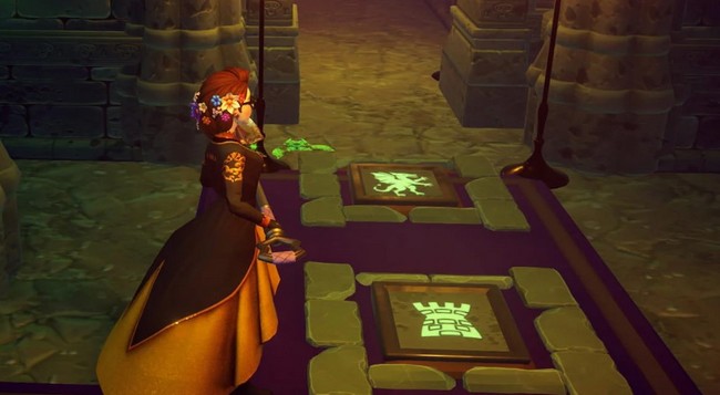 Les symboles à mettre à l’endroit sont les suivants : un Dragon en haut et une Tour en bas. Une fois les symboles correctement orientés, vous devrez creuser les dalles au sol pour les aligner.