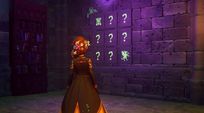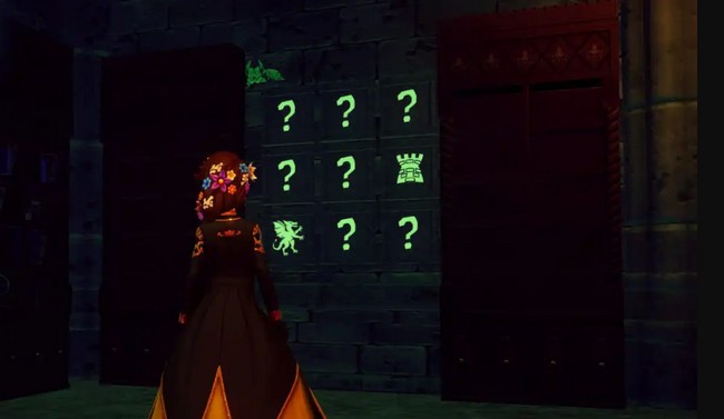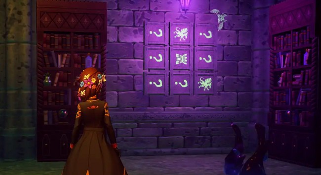 Pour obtenir la statue de Maléfique, il vous faudra résoudre une série d’énigmes dans le palais. La première étape consiste à ouvrir la porte en bois située à gauche de Maléfique, mais cette porte ne peut être ouverte qu’à l’aide d’un code à entrer au sol. L’indice pour ce code se trouve un peu plus loin, en montant des escaliers, sur un mur. Les symboles présents sur ce mur sont à l’envers, ce qui signifie que vous devrez les inverser pour résoudre l’énigme.