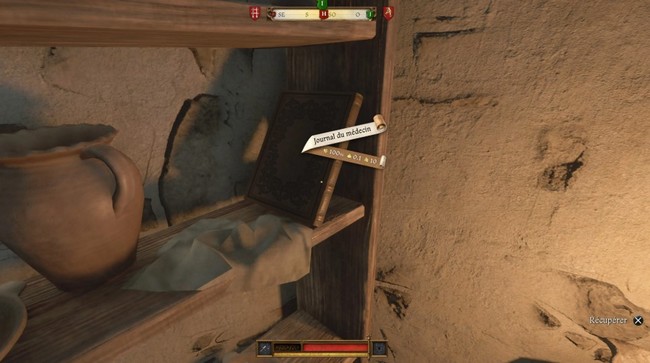 - Trouvez l’atelier : L’atelier du médecin est une pièce contenant des étagères, un coffre et un alambic. C’est ici que vous trouverez le journal.