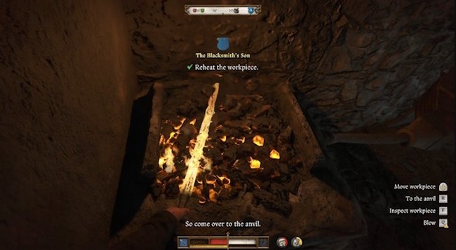 Si vous travaillez avec une pièce courte, chauffez-la jusqu’à ce qu’elle devienne de couleur « jaune blé » et retirez-la du feu. Pour des armes plus longues, il est nécessaire de déplacer constamment le métal afin de garantir un chauffage uniforme. Si la température devient trop élevée, vous entendrez Henry (le personnage principal) se plaindre, ce qui indique que l’arme est trop chaude et que la qualité de la forge pourrait être compromise.
