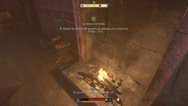 Retournez au niveau des escaliers et montez un peu plus haut. Vous arriverez devant une porte gardée par un soldat. Entrez dans la pièce et éteignez la cheminée qui se trouve sur votre droite dès votre entrée. Il vous faudra à nouveau verser de l’eau bénite pour accomplir cette tâche.