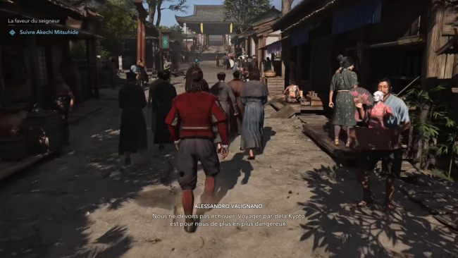 Votre première tâche consiste à suivre Akechi Mitsuhide, un samouraï loyal à Nobunaga. Utilisez le joystick gauche (ou les touches WASD sur PC) pour avancer et rester à sa suite. Profitez de ce moment pour observer les détails du paysage urbain de Kyoto, richement modélisé.