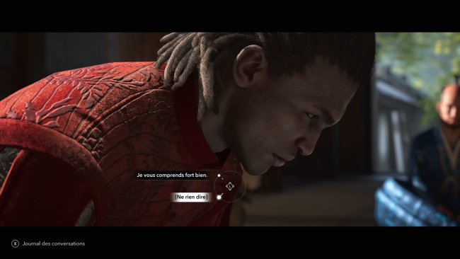 Si vous optez pour la seconde option, Yasuke reste silencieux, ce qui entraînera des répliques supplémentaires. Vous aurez alors à nouveau deux possibilités :