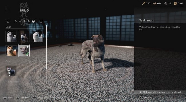 Une fois placés, les animaux circuleront librement dans la cachette, rendant l’endroit plus vivant. Les animaux spéciaux et nommés, comme Tsuki-maru, ne peuvent être placés qu’une seule fois, tandis que les animaux communs peuvent être ajoutés en plusieurs exemplaires.