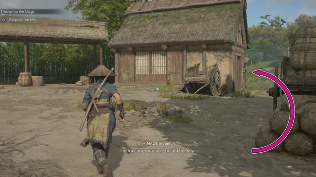 Une fois la belle-sœur d’Ichiro disparue, vous pourrez commencer votre recherche de la clé. Il vous faudra observer attentivement votre environnement pour repérer des indices. En maintenant L2/LT (par défaut) pour activer votre vision d’aigle, vous ferez apparaître trois points bleus signalant des endroits suspects. Celui qui vous intéresse se situe au nord-est de l’endroit où vous avez discuté avec Takako.