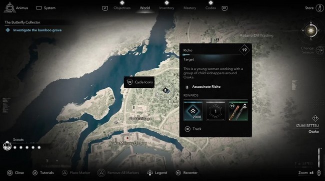 Pour retrouver Kacho, commencez par interroger un marchand de papier situé au centre d’Osaka, près d’un grand arbre au nord du temple. Il vous apprendra que Kacho se cache dans une maison proche du jardin Nishinomaru, à l’ouest du château d’Osaka.