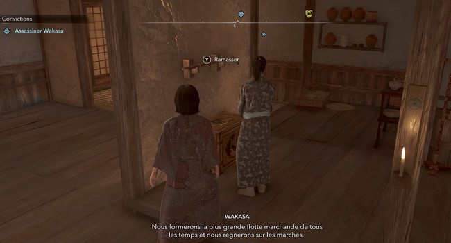 - Une approche soignée et discrète vous permettra d’assassiner Wakasa efficacement.
