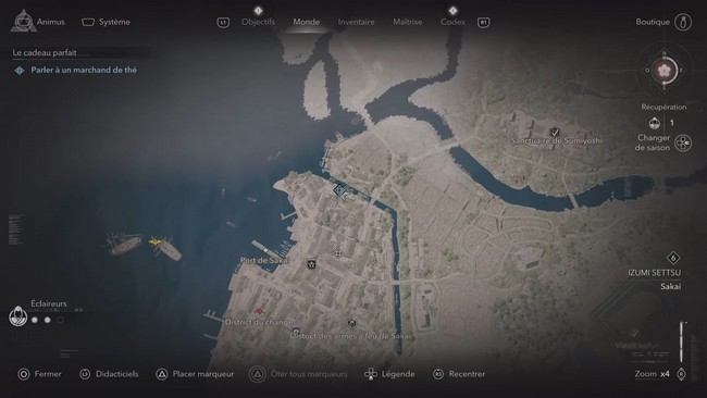 Une fois la quête « Le Cadeau parfait » activée, elle apparaîtra sous la catégorie « Le Teppo d’or » dans le tableau des objectifs principaux de votre menu. La première étape consiste à localiser un marchand de thé qui vous enseignera l’étiquette propre à cette cérémonie traditionnelle.