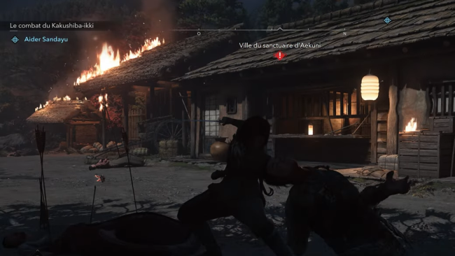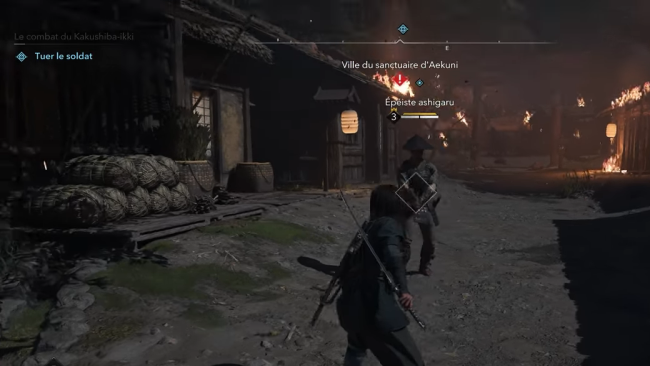 En atteignant la ville du sanctuaire d’Aekuni, Naoe est contrainte de descendre de cheval pour se défendre. Ce segment sert de tutoriel de combat, introduisant les mécaniques de parade, esquive et attaque.
