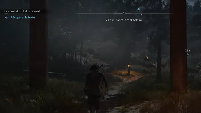 La mission commence immédiatement après celle de Yasuke. Vous incarnez Naoe, accompagnée de son père Nagato, alors qu’ils attendent l’arrivée des forces ennemies. Une cinématique poignante donne le ton avant que les deux ne prennent la route vers le sanctuaire d’Aekuni.