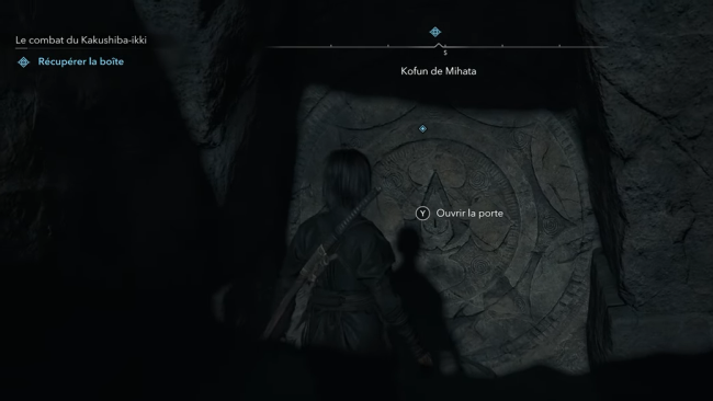 En traversant la rivière et en escaladant la colline, Naoe atteint enfin le Kofun de Mihata. Pour ouvrir la porte ornée de symboles anciens, utilisez la lame secrète. À l’intérieur, un coffre renferme un artefact mystérieux.