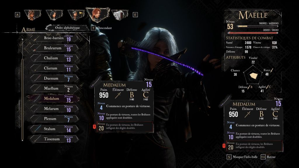 Dès l’obtention de Medalum, Maelle démarre en posture virtuose, boostant ses dégâts de 200 % et doublant l’effet des brûlures. Cela transforme littéralement son impact sur le champ de bataille.