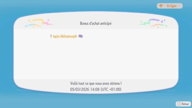 En mars 2026, Pokémon Pokopia met déjà à disposition un premier bonus identifié : le Tapis Métamorph lié à l’achat anticipé. Pour le récupérer, le joueur doit d’abord avancer dans l’aventure, débloquer le PC qui se trouve devant la première ruine du Centre Pokémon, puis passer par la section « recevoir des objets » afin d’ouvrir le menu des Cadeaux Mystère. Les récompenses peuvent ensuite être obtenues soit en ligne, soit à l’aide d’un code, avec la possibilité de voir de nouveaux bonus apparaître par la suite.