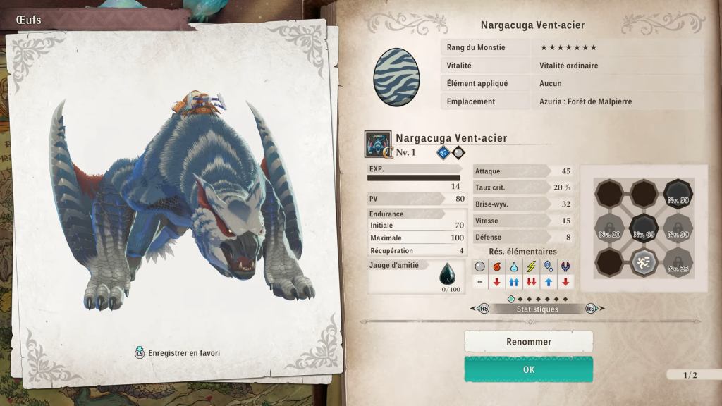 Obtenir un œuf n’est que la première étape, car le but est aussi de trouver un spécimen fort et doté de gènes intéressants. Pour cela, il est crucial de garder à l’esprit que vous cherchez un Nargacuga avec une vitalité élevée, qui pourra se développer et devenir un allié solide dans votre aventure.