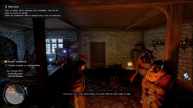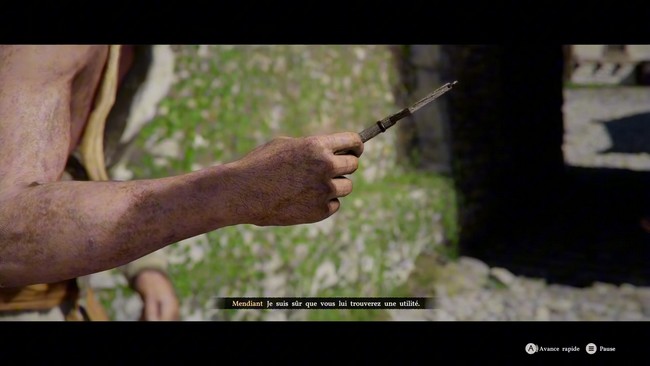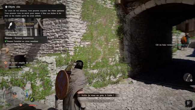 - Après le mini-jeu dans la taverne : Une fois le mini-jeu terminé, il vous faudra sortir de la taverne et chercher un mendiant allongé près d’une trappe. Il est important de lui donner une pièce. Ce geste déclenche un événement clé : le mendiant vous remet une mystérieuse clé en bois, un objet qui semble simple en apparence, mais qui est essentiel pour la suite de la quête.