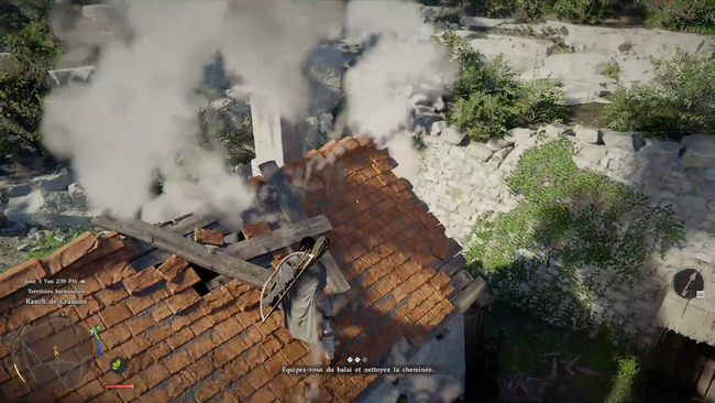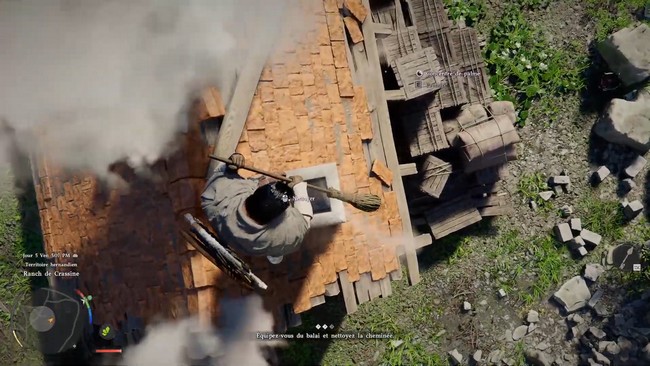 L’action cruciale de la quête consiste à nettoyer la cheminée. Mais attention : vous ne pouvez pas accomplir cette tâche depuis le sol. Vous devez être directement sur le toit, et plus précisément sur la cheminée. Une fois bien positionné, appuyez sur le bon bouton pour nettoyer la cheminée à l’aide du balai. Ce n’est pas toujours évident, surtout avec la fumée, mais une fois en place, l’option pour nettoyer se débloque. - Récompenses et conclusion :