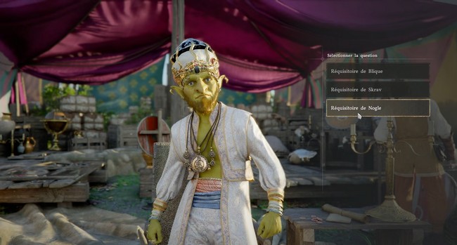 Pour entamer la quête correctement, vous devez commencer par parler de la situation avec Shakatu. Le dialogue commence par un choix fondamental : le réquisitoire de Blique. Ce choix est crucial pour établir les bases de la mission. Après avoir sélectionné ce premier réquisitoire, Shakatu vous guidera vers la suite des étapes.