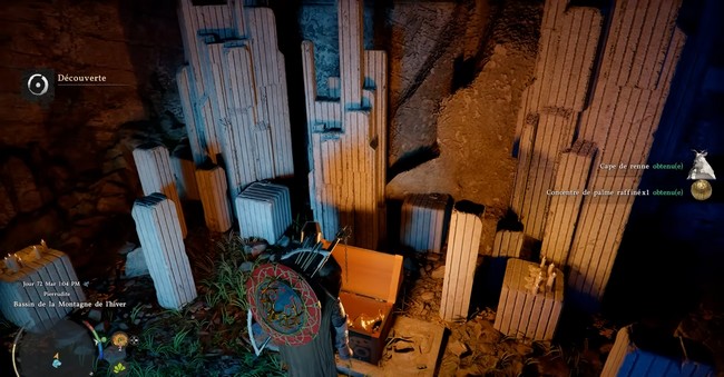 Lorsque vous trouvez ce mur brillant, il vous suffit de l’endommager avec votre capacité spéciale de force de paume. Une fois le mur détruit, un coffre se trouve derrière. C’est dans ce coffre que vous trouverez la cape de renne, un équipement essentiel pour améliorer vos compétences de chasse.