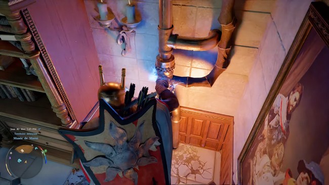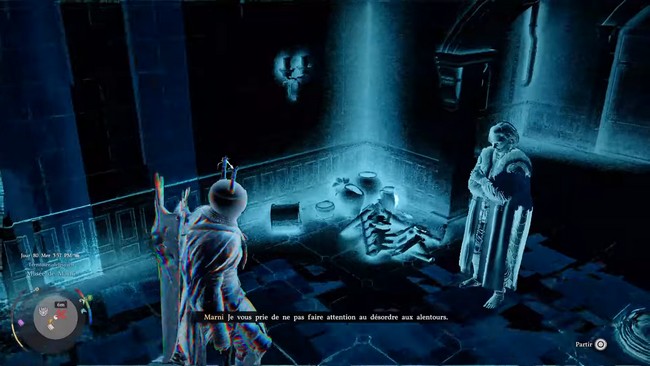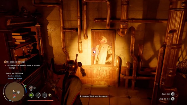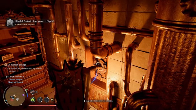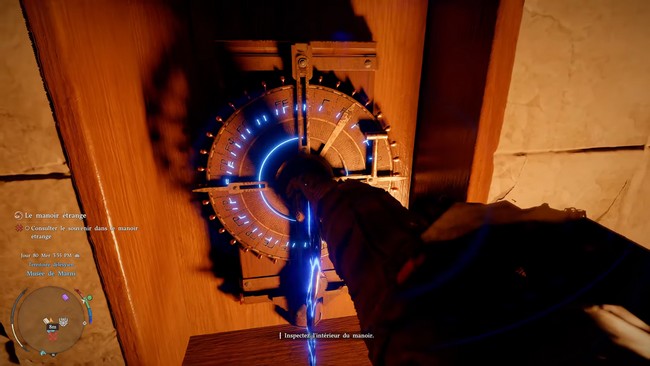 Dès votre entrée dans le manoir, avancez tout droit et cherchez un tableau accroché au mur. Utilisez une lanterne pour l’éclairer et interagissez avec lui. Ce geste révélera un engrenage dissimulé derrière le tableau. Mettez alors le casque Visione et interagissez avec le mécanisme. L’objectif ici est de faire tourner les aiguilles des minutes et des heures pour les aligner correctement jusqu’à ce qu’elles s’illuminent simultanément en bleu. Pour ce faire, déplacez les aiguilles juste avant qu’elles ne deviennent bleues, puis tournez-les ensemble. Si vous réussissez cette opération, le disque entier brillera en bleu.