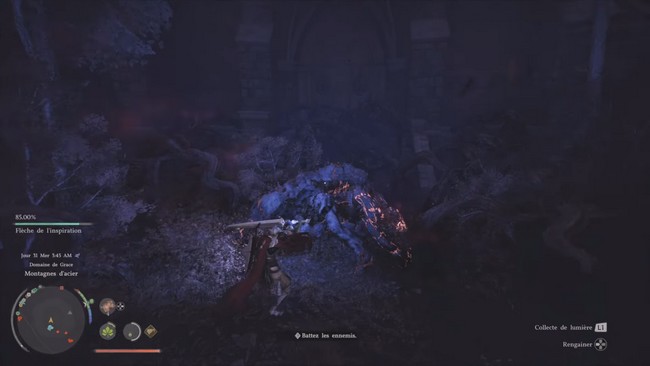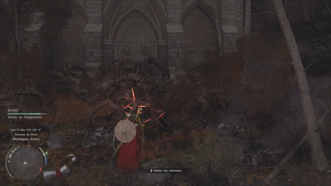 • Pour brûler ces ronces, vous devez concentrer de la lumière sur elles. Ce n’est pas aussi difficile qu’il n’y paraît, mais vous devez savoir comment procéder. Pour cela, maintenez simultanément les boutons R1 et L1, puis continuez à maintenir L1 pour concentrer la lumière sur les ronces. Lorsque la lumière se concentre assez longtemps, elle va brûler les ronces et dégager le passage. Il s’agit d’une méthode simple mais efficace pour ouvrir la voie vers l’intérieur de la Flèche.