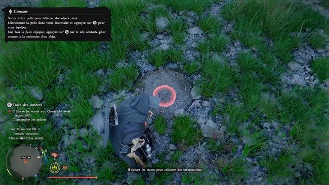 - Utilisation de la pelle : Pour pouvoir creuser et découvrir l’indice, il vous faut une pelle. Equipez-vous de celle-ci avant de commencer à creuser. Dirigez-vous vers l’un des monticules et une invite apparaîtra lorsque vous serez à la bonne position. Si l’invite ne s’affiche pas et que vous ne parvenez pas à creuser, vérifiez que vous utilisez une pelle de base, non améliorée. Les pelles améliorées peuvent parfois causer des bugs, rendant le creusage impossible.