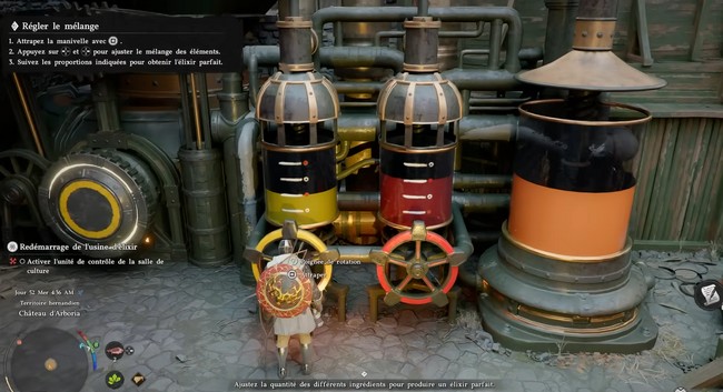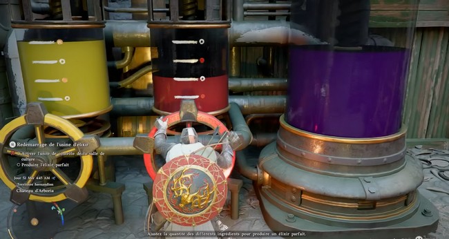 - Dans la salle de production, vous trouverez deux cuves avec des couleurs. Réglez la cuve jaune au maximum et faites baisser la cuve rouge au minimum. Cette manipulation permet au liquide de circuler correctement dans les tuyaux et de finaliser le processus.