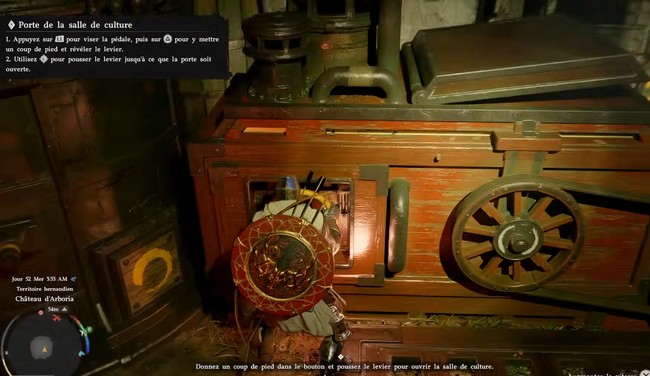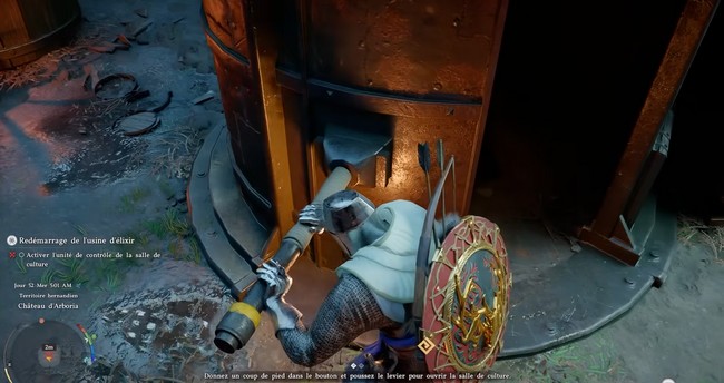 - Une fois ces étapes complétées, retournez à l’endroit où vous avez activé le premier interrupteur, donnez un coup de pied pour faire sortir un levier et ouvrez la porte menant à une salle secrète. À l’intérieur, vous trouverez un casier avec le pulvérisateur d’engrais.