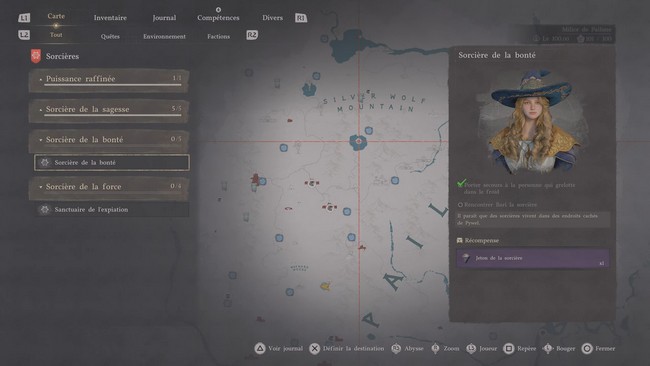 Trouver la sorcière de la Bonté peut sembler un véritable défi, car elle est cachée dans une zone reculée, loin des chemins habituels. Pour la localiser, dirigez-vous vers la montagne, près du « A » de Pailune.