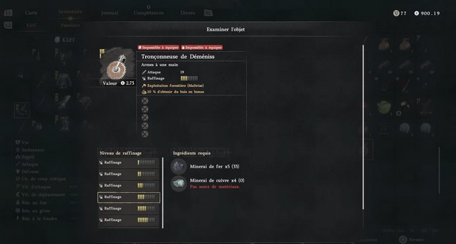 Après avoir récupéré la tronçonneuse, vous pourrez l’équiper et commencer à couper du bois plus rapidement. Si vous souhaitez augmenter l’efficacité de la tronçonneuse, vous pourrez l’améliorer chez le forgeron.