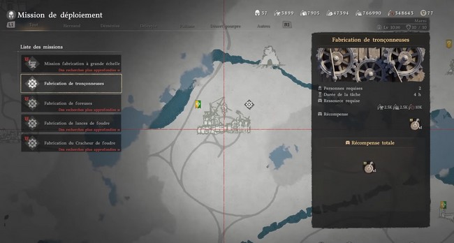 Une fois la zone libérée, vous devrez retourner à votre campement et ouvrir l’option des missions de déploiement. Il vous faudra envoyer vos compagnons les plus compétents dans la fabrication de la tronçonneuse.