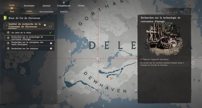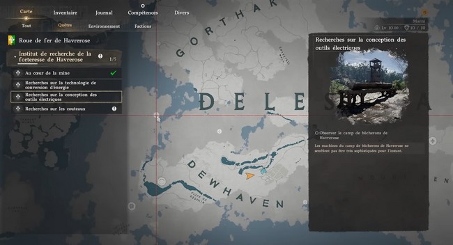 Une fois la première recherche terminée, vous pourrez débuter la deuxième recherche, celle qui débloque la fabrication de la tronçonneuse. Cette recherche nécessite également de compléter quelques quêtes secondaires dans la zone.