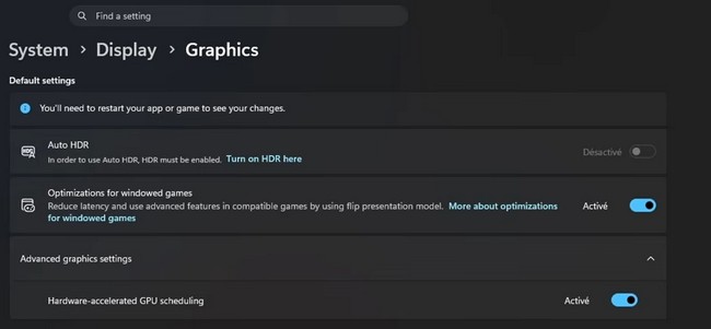 - Paramètres graphiques avancés : Dans la section graphique, activez l’option « Hardware-accelerated GPU scheduling » pour permettre une gestion plus fluide de votre GPU par Windows.